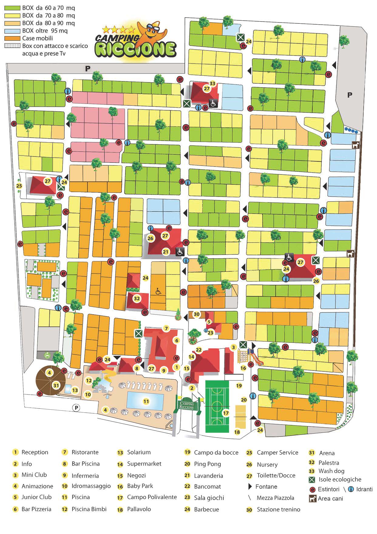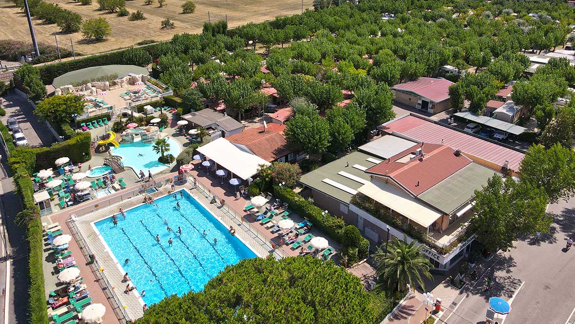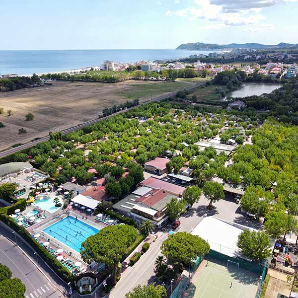 Moderno complesso turistico, unico 4 stelle di Riccione, situato nel cuore verde di Riccione a m. 300 dal mare a km 1,2 dalle Terme e a km 2 dal centro città collegati da trenino navetta gratuito del campeggio e da trasporto pubblico.